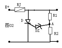 1、直流觸發電路:如圖G2是一個電視機常用的過壓保護電路,當E+電壓過高時A點電壓也變高,當它高于穩壓管DZ的穩壓值時DZ道通,可控硅D受觸發而道通將E+短路,使保險絲RJ熔斷,從而起到過壓保護的作用。