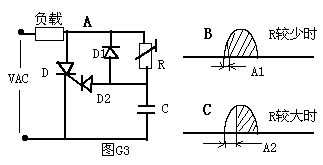 2、相位觸發電路:相位觸發電路實際上是交流觸發電路的一種,如圖G3,這個電路的方法是利用RC回路控制觸發信號的相位。當R值較少時,RC時間常數較少,觸發信號的相移A1較少,因此負載獲得較大的電功率;當R值較大時,RC時間常數較大,觸發信號的相移A2較大,因此負載獲得較少的電功率。這個典型的電功率無級調整電路在日常生活中有很多電氣產品中都應用它。